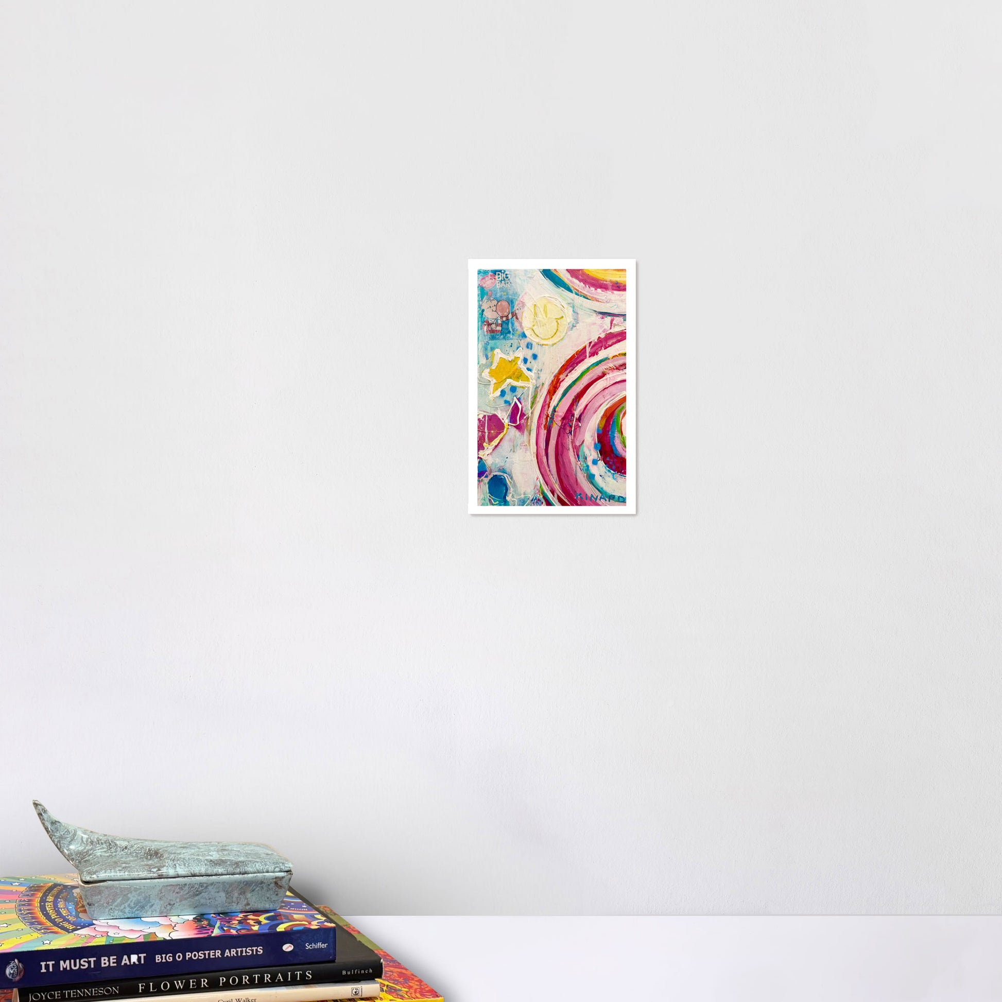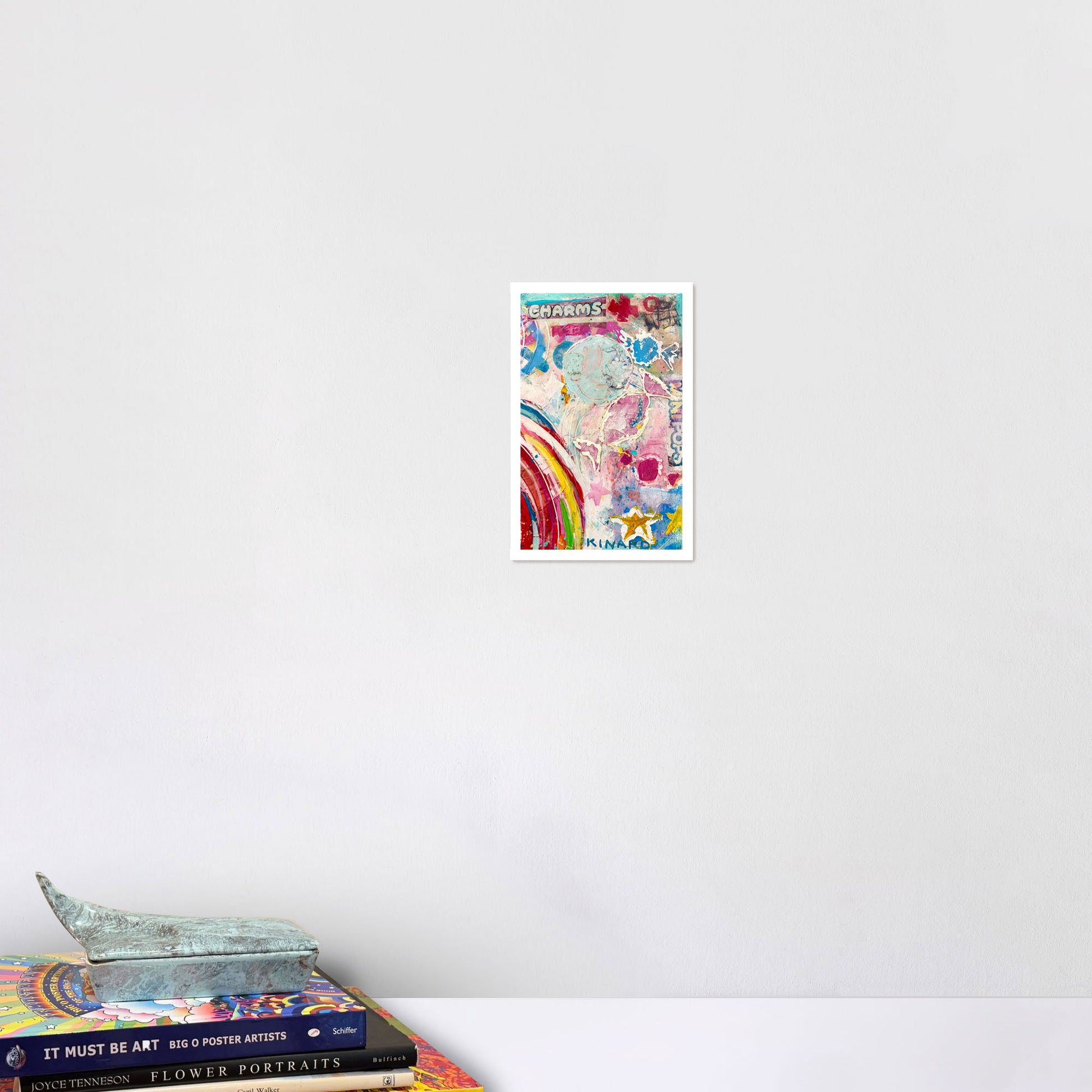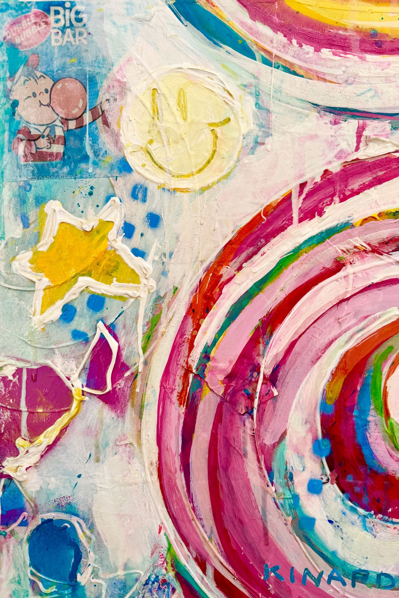 Hubba Bubba is a celebration of happiness found in layers built and pulled apart then built again. Deconstructed from an original painting using candy wrappers thick paint and bold marks this piece leans into joy that is playful imperfect and full of surprise. Smiles hide in the surface symbols drift in and out and color shows up exactly where it wants to be. It is a reminder that happiness can be made uncovered and even stumbled upon when you let things be a little messy. This print marks a new chapter in my print line where art is meant to feel light curious and quietly optimistic.